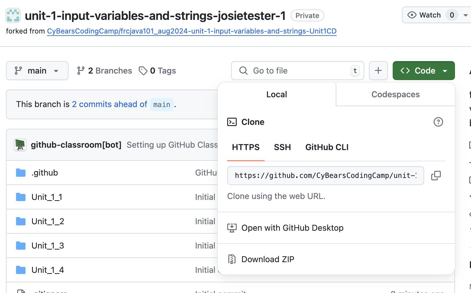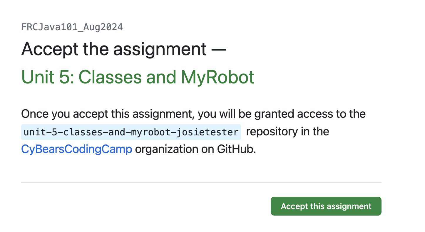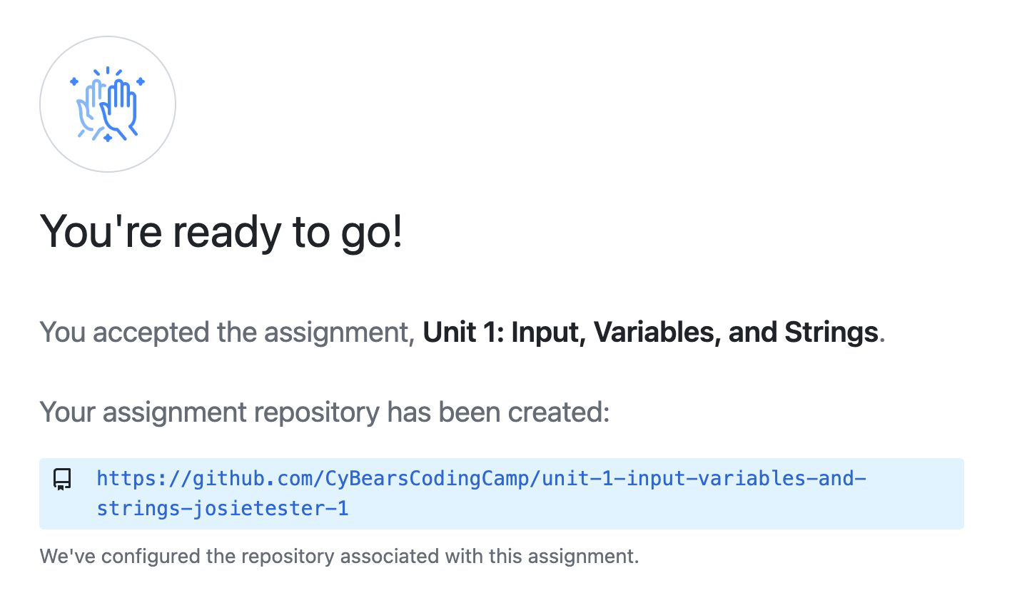 Open the GitHub Classroom invite for your unit and click “Accept this assignment”. Wait for GitHub to create your personal repository.