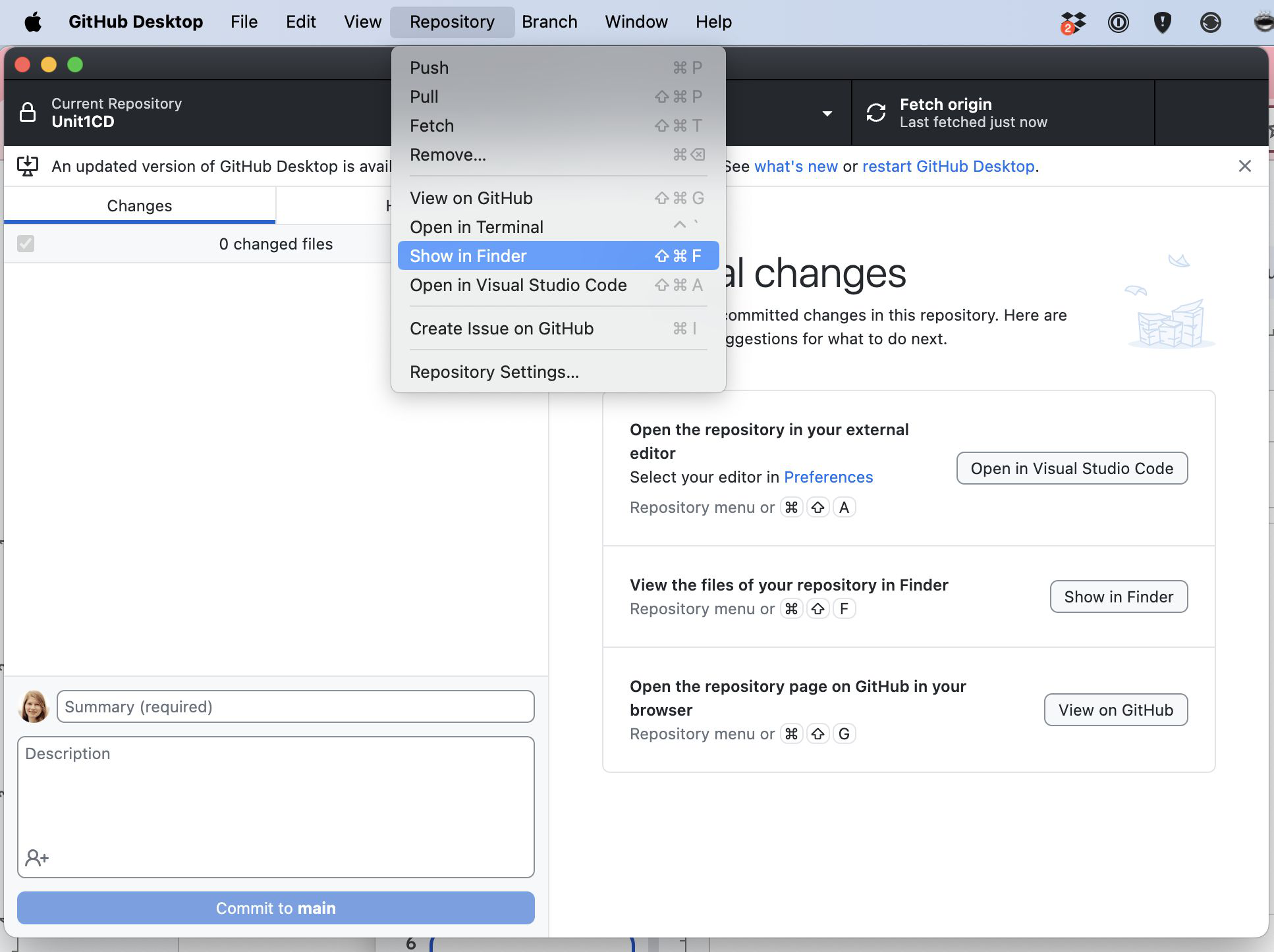 In GitHub Desktop, choose Repository → Open in Visual Studio Code.