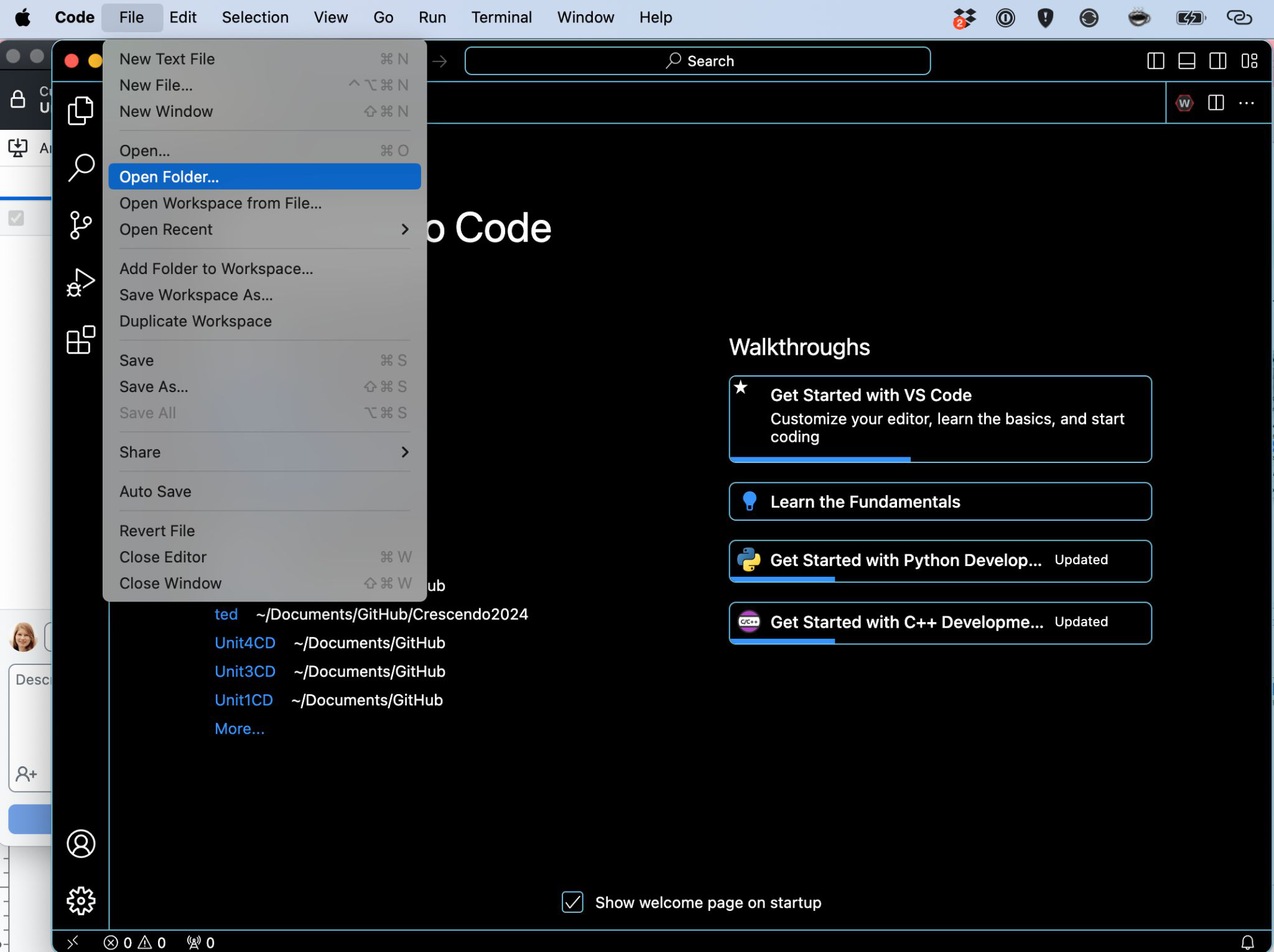 VS Code should open directly to your cloned repository folder. If prompted, trust the authors and install recommended extensions.