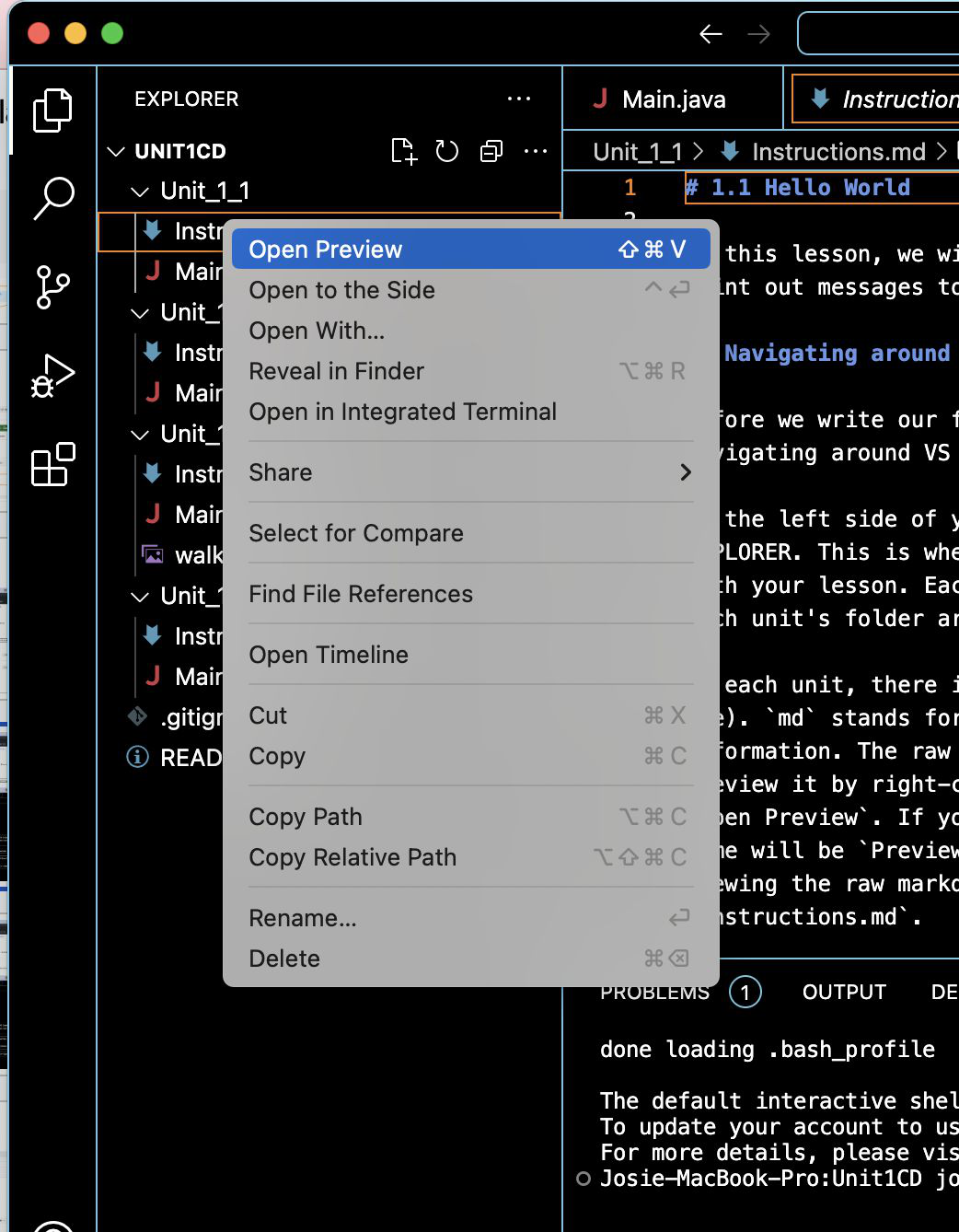 In the Explorer, open the unit’s instructions file (e.g., Unit_1_1/Instructions.md). Right-click and choose Open Preview or press Shift+Ctrl+V (Windows/Linux) or Shift+Cmd+V (macOS).